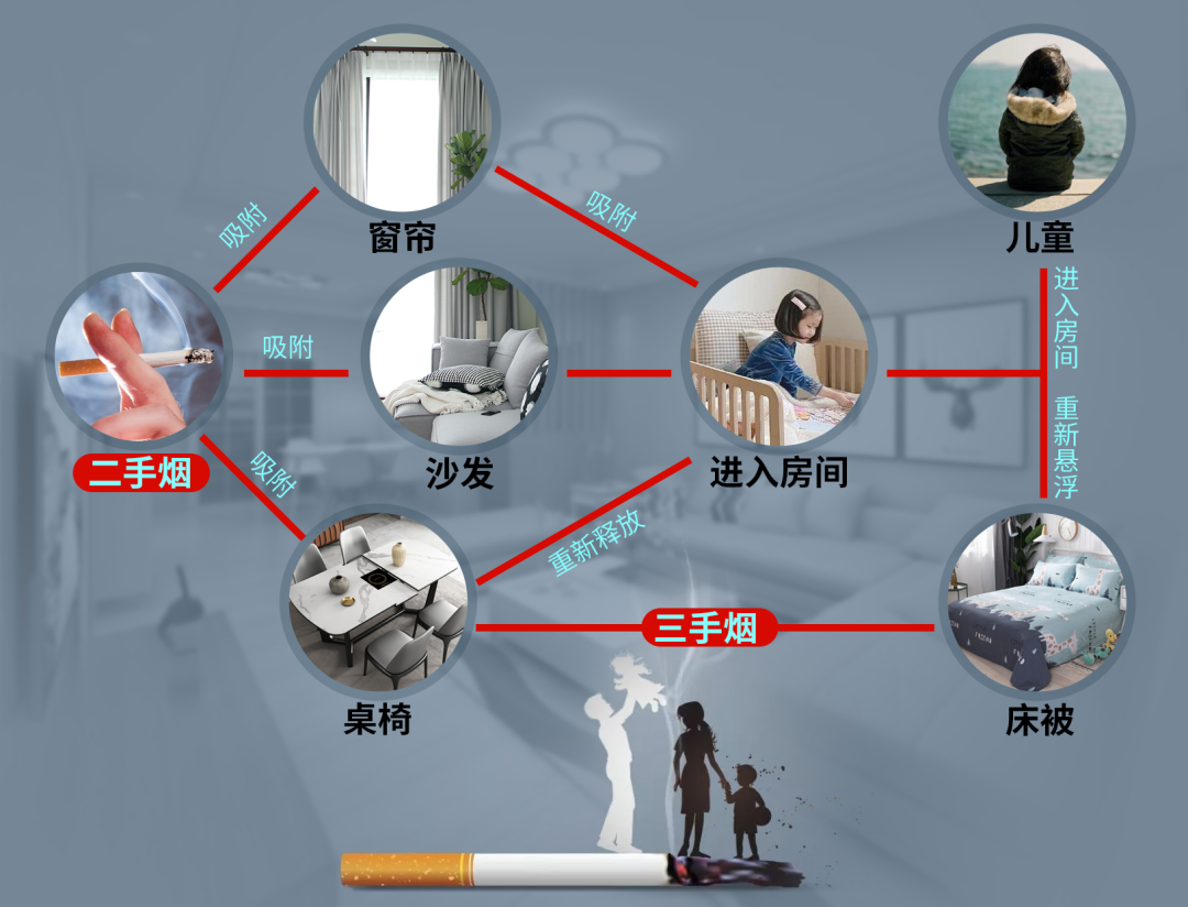 就算是煙霧散盡后,附在屋子里、衣服上的殘留物質也可能造成危害,它被稱作「三手煙」,同樣含有尼古丁、致癌物等